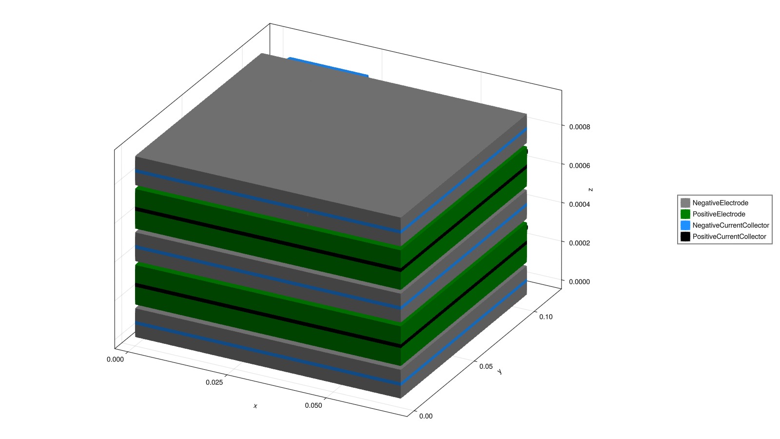 We can also create a multi-layer pouch geometry by modifying the Cell parameters. The number of layers is controlled by NumberOfLayersInParallel, and for a single layer simulation we can also choose to have double coated electrodes by setting DoubleCoatedElectrodes to true.