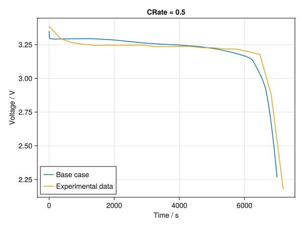 We can now compare the results of the calibrated model against the experimental data for the 0.5C discharge curve.