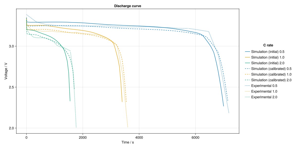 We can now compare the results of the calibrated model against the experimental data for the 2.0C discharge curve. We compare three simulations against the experimental data: