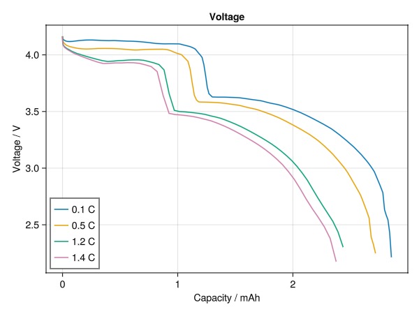 ax = Axis(fig[1, 1], title = "Voltage", xlabel = "Capacity / mAh", ylabel = "Voltage / V")