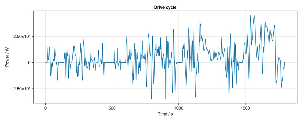 ax = Axis(fig[1, 1], title = "Drive cycle", xlabel = "Time / s", ylabel = "Power / W")