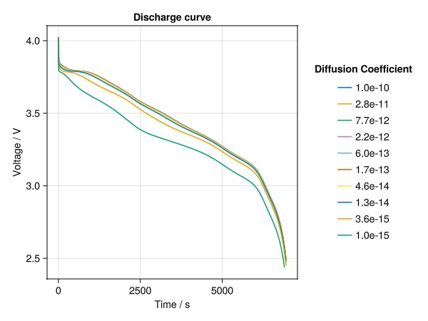 Lets now see the effect that the diffusion coefficient of the positive electrode has on cell performance. We first set the reaction rate to the original value in the parameter set, and then follow the same procedure as above.
