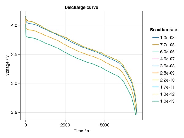 ──────────────────────────────────────────────────Now, plot the discharge curves for each reaction rate: