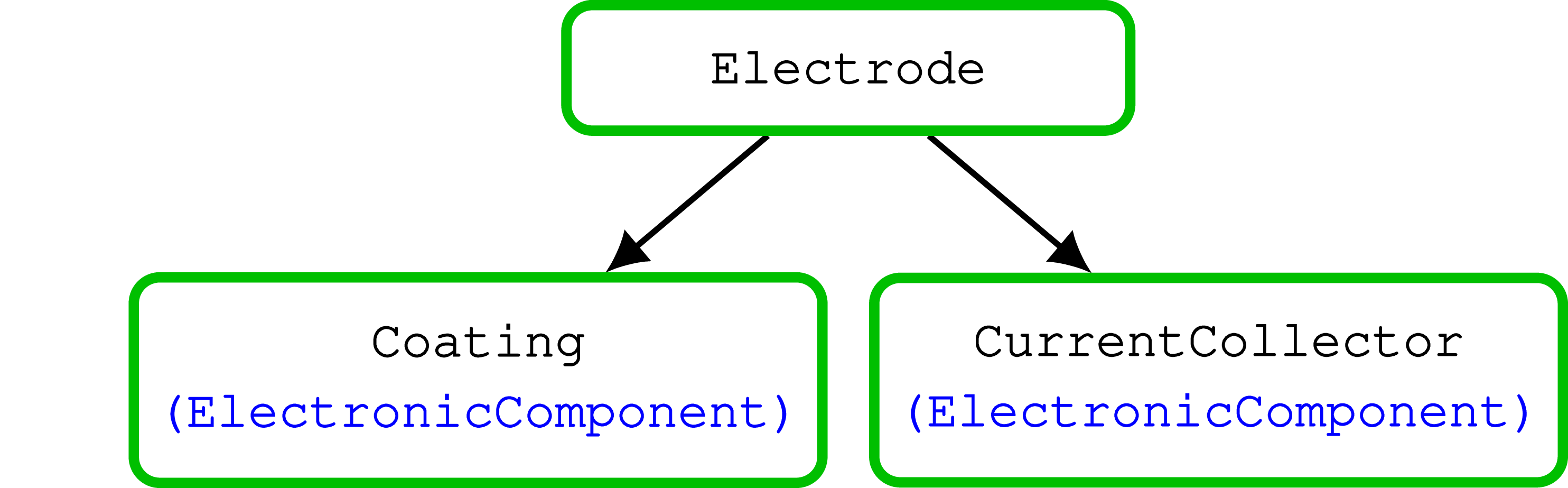 The negative and positive electrodes are instances of the same electrode model. An electrode contains a coating material and a current collector. The standard input parameters for an electrode model are given in its schema. The electrode model has two sub-models: