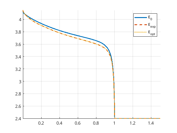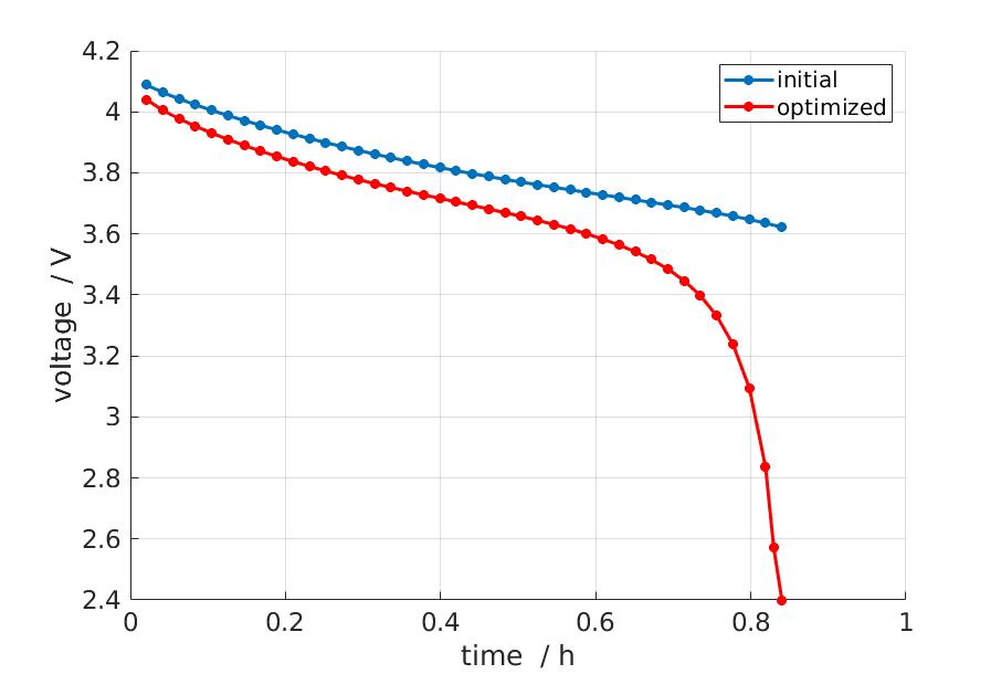 Now we can perform the optimization by calling BFGS, a well-tested, effective gradient-based optimization algorithm. After performing the optimization, we evaluate the optimal voltage discharge profile and print the optimized parameters.