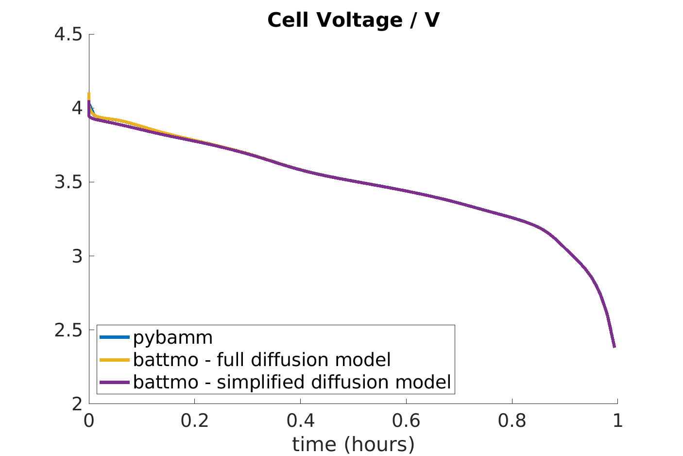 We reproduce the last plot produced in this script here. We observe a good overall match between the full and reduced model for solid diffusion. The discripancies are large only at the beginning of the discharge. We observe also a good agreement between BattMo and PyBaMM.